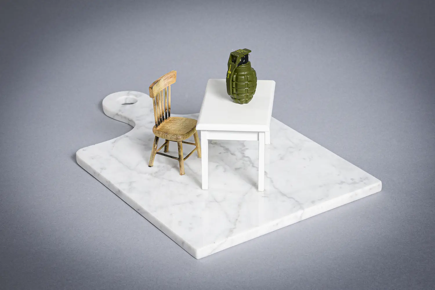 Estas obras de MAE examinan la violencia con ironía y múltiples referencias al espacio doméstico. Porque le inquieta personalmente el alcance de la violencia, y su impacto en la sociedad chilena contemporánea.
