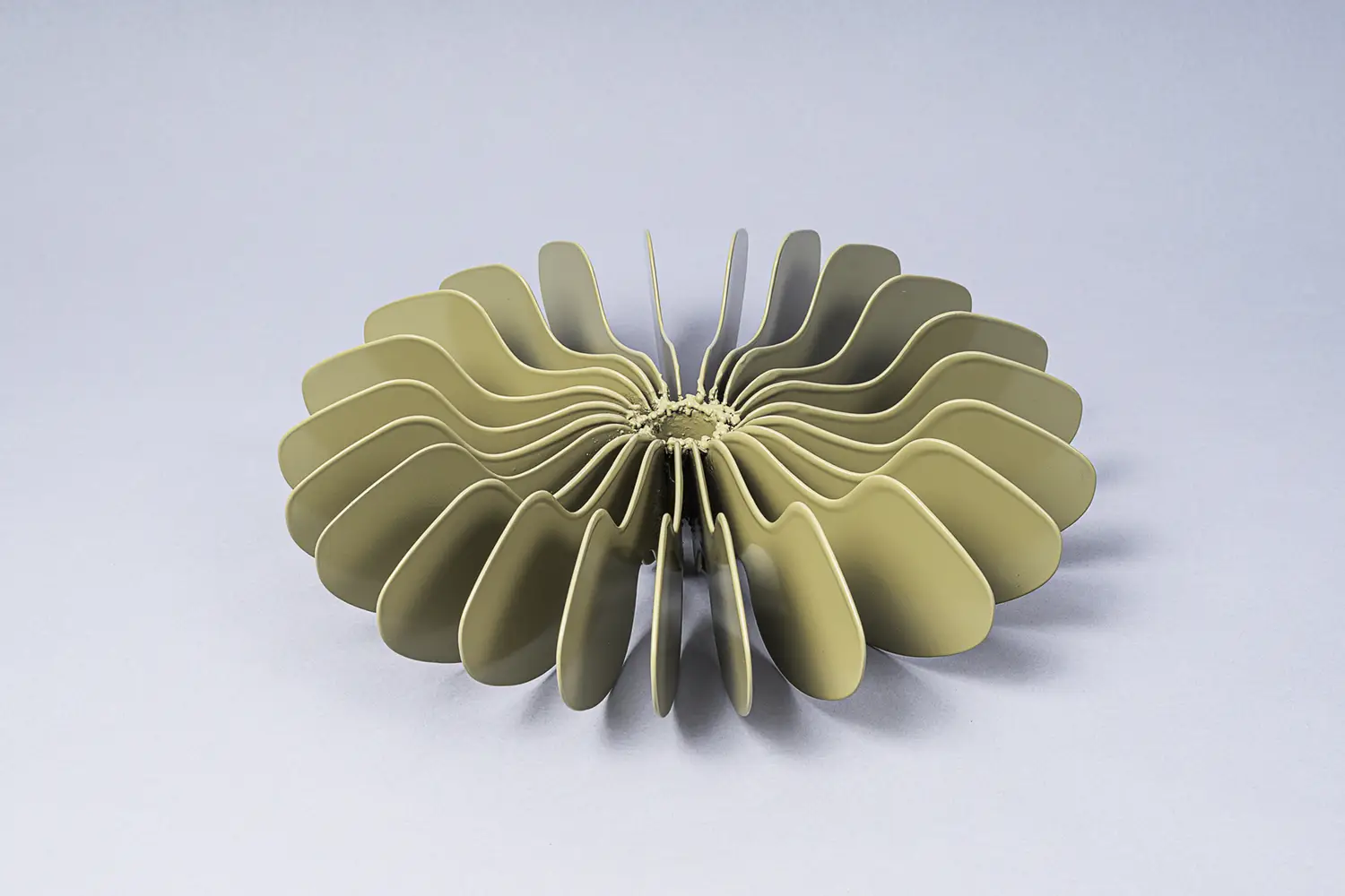 En los últimos años, la obra de Angélica Echavarri ha dirigido su mirada hacia el caos y la violencia. Desde allí ha generado piezas que articulan este diagnóstico a través de montajes paródicos y esculturas de madera, de lenguaje abstracto y dinámico. Quizás estas obras permitan comprender, en parte, lo que ocurre en este nuevo cuerpo de trabajo. Aquí cada pieza expuesta es la reiteración de una forma que, al girar en torno a un eje central, produce un volumen cerrado en sí mismo. Es como si se tratara de una reacción: el reverso de su producción más reciente.