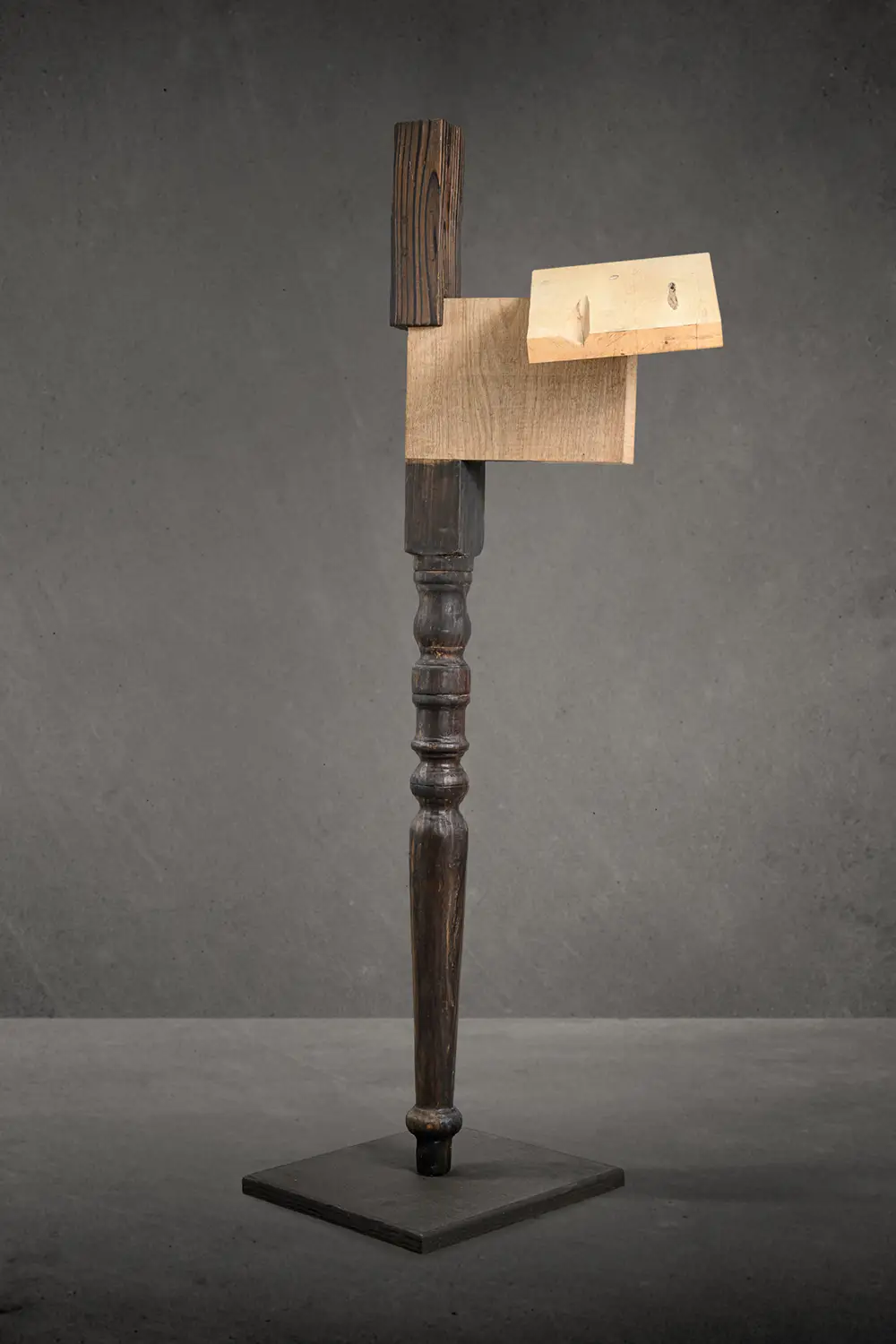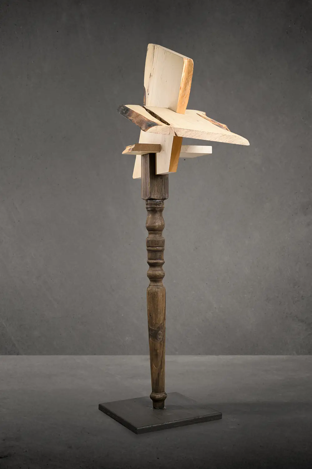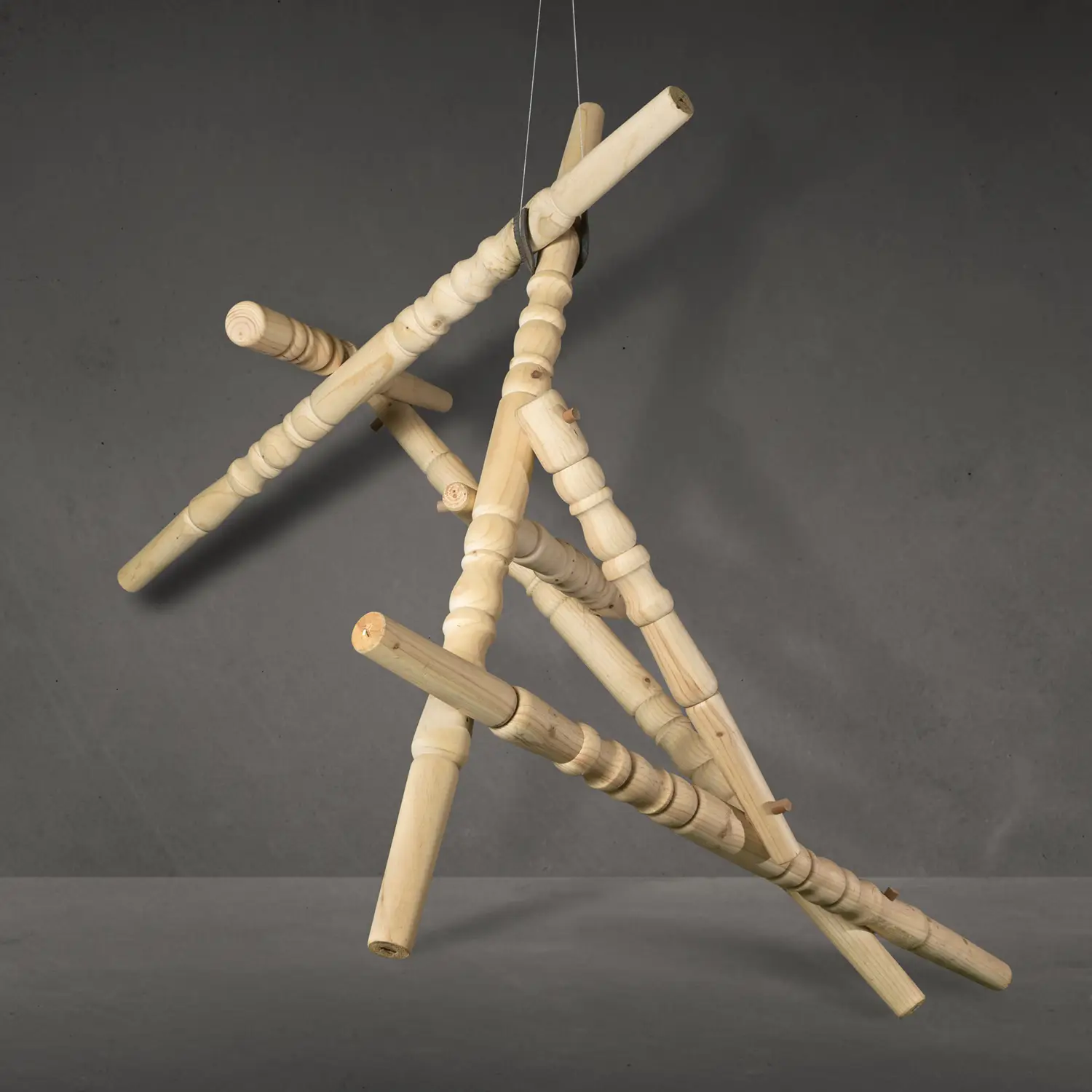 El móvil de Echavarri parece reunir ambos atributos: solidez y movimiento. Pero su apariencia es más bien tosca, su color no es otro que el de la madera torneada, sus formas, aquellas de los muebles populares que imitan- con una exageración algo torpe e ingenua- los adornos del mobiliario aristocrático. Una imitación inespecífica que no evoca directamente ningún estilo conocido, pero cuya vaguedad parece recordarlos a todos. Se mueve, si, pero está lejos de la levedad Calderiana, al contrario, luce pesado y paradójicamente dinámico gracias a las diagonales que trazan la unión de sus partes. En oposición a las delicadas placas metálicas y el esbelto varillaje de los Móviles de Calder, esta obra está conformada por siete patas de madera torneada que declaman sin alharaca una pesadez, remachada con tarugos a la vista. Una falsa antigualla que habita la modernidad dinámica de los constructivistas, pero con unos modales que le son ajenos a aquel mundo. Es de madera y no de metal, su superficie es opaca y en vez de la desnuda geometría de los constructivistas ofrece unos adornos de señorío colonial totalmente fuera de lugar. Ahí su irónica gracia.