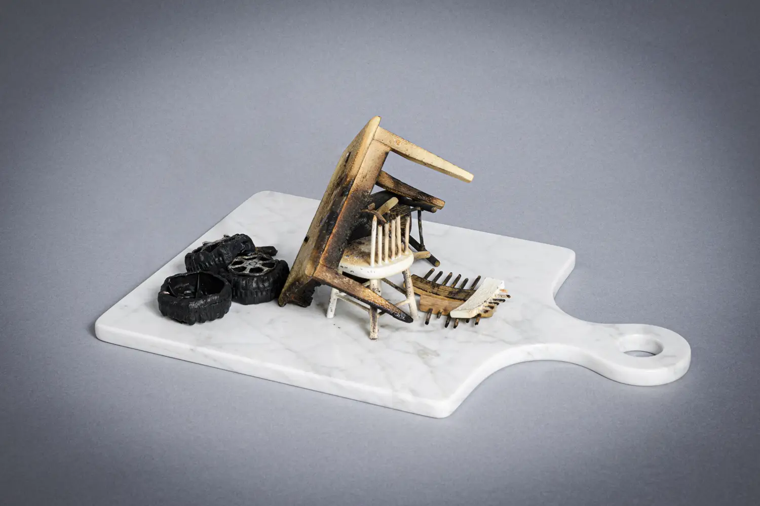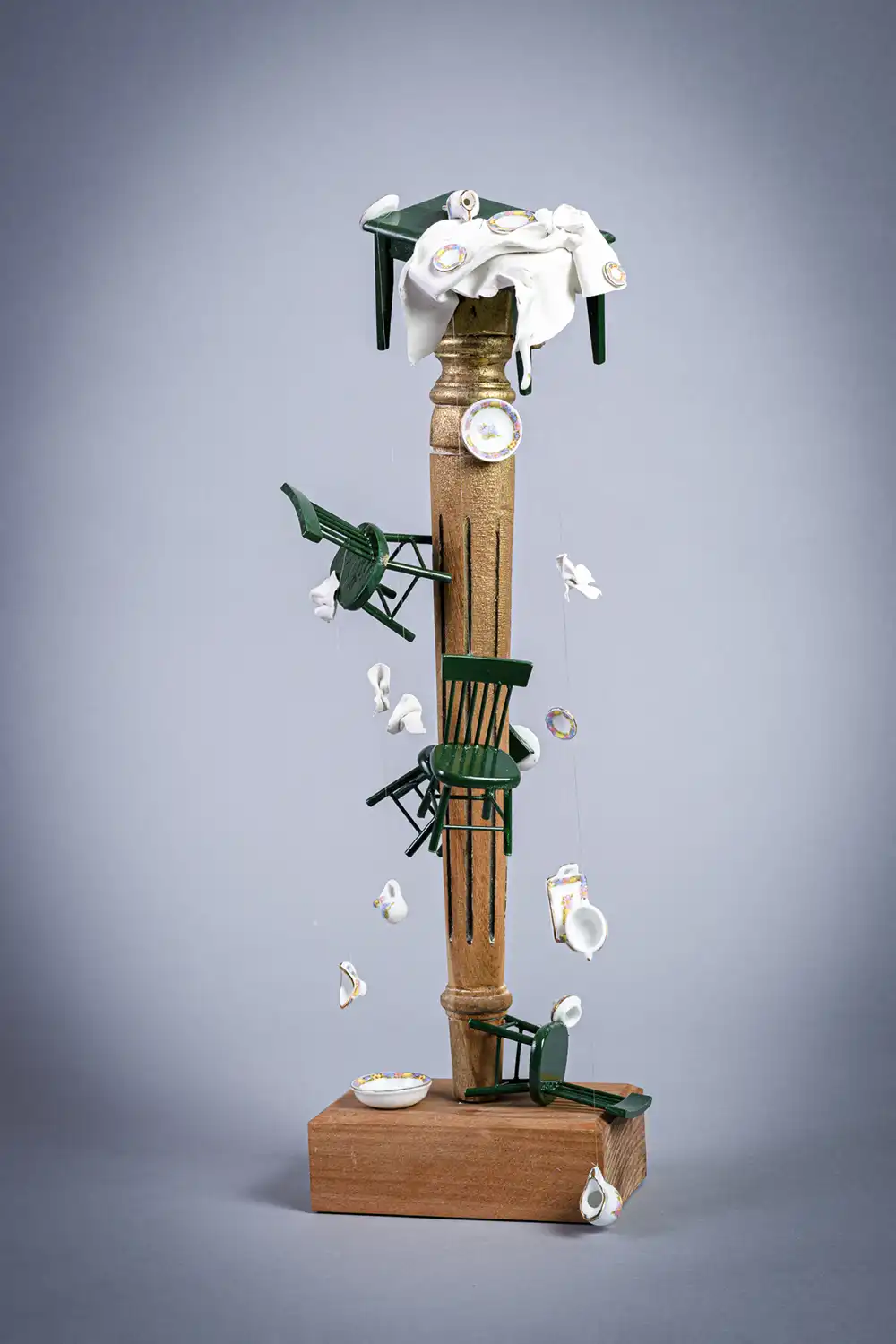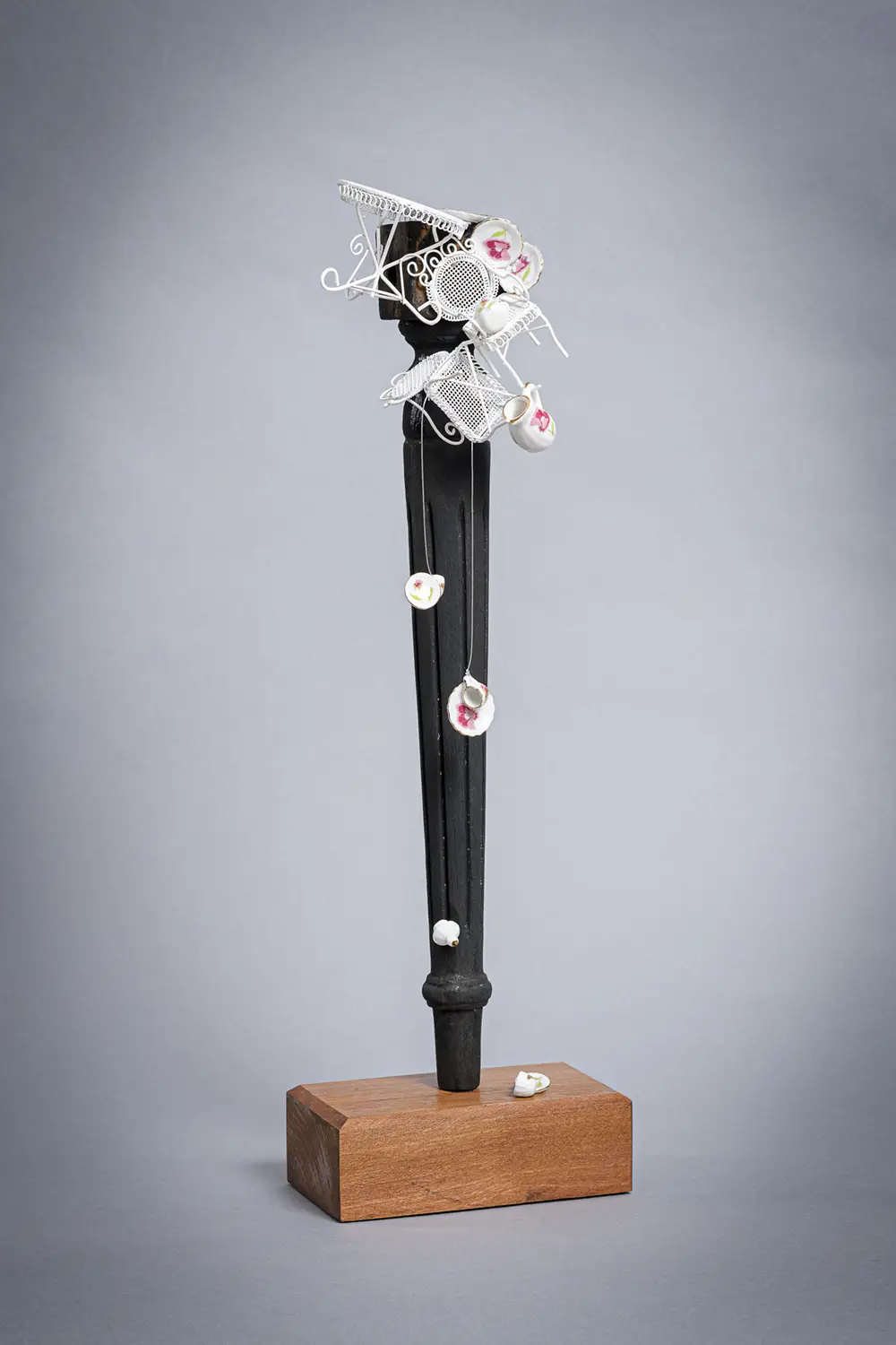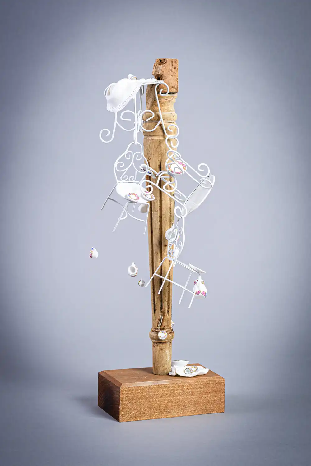 Las esculturas construidas con patas de mesas o sillas y unos pequenos y delicados juegos de té, parodian la tranquilidad burguesa que de un momento a otro se ve amenazada por la violencia directa o ambiental que nos rodea. Hoy somos obligados consumidores de violencia urbana y la hemos incorporado como una inquietante música de fondo. En pequenas vinetas, montadas con los accesorios de una sala de juegos, la artista recrea con ironía unas escenas que ocurren tanto en la calle como en el hogar. En unas, la destrucción es una amenaza que puede ocurrir en cualquier momento (como en aquella habitación con una granada enorme sobre la mesa) en otras muebles y vehículos han sucumbido a las llamas o incluso al trabajo destructor de una sierra. Son piezas en las que la artista ha jugado con un imaginario violento, que debe tanto a la realidad como al cine de animación, quizás como un intento por superar sus propios traumas, o los nuestros. Que resulten humorísticas, que apelen al ridículo es casi un acto reparador, el pánico a la violencia real, y próxima, aparece de una manera abordable, sujeta al control y hasta la parodia de la artista. Pero el humor, no la hace menos inquietante.