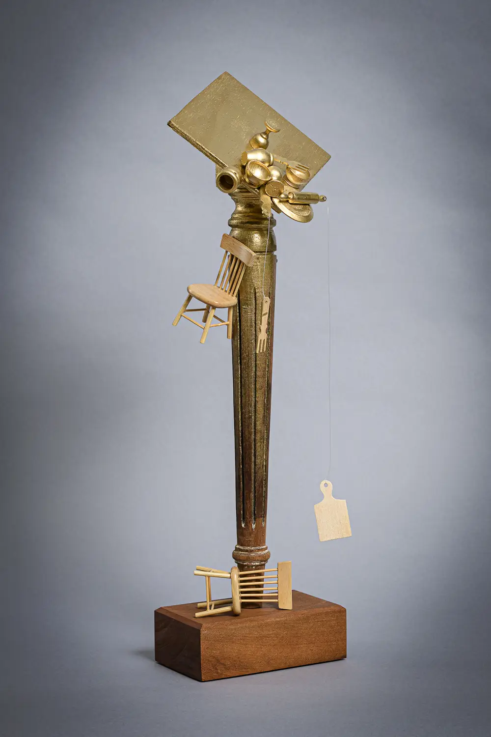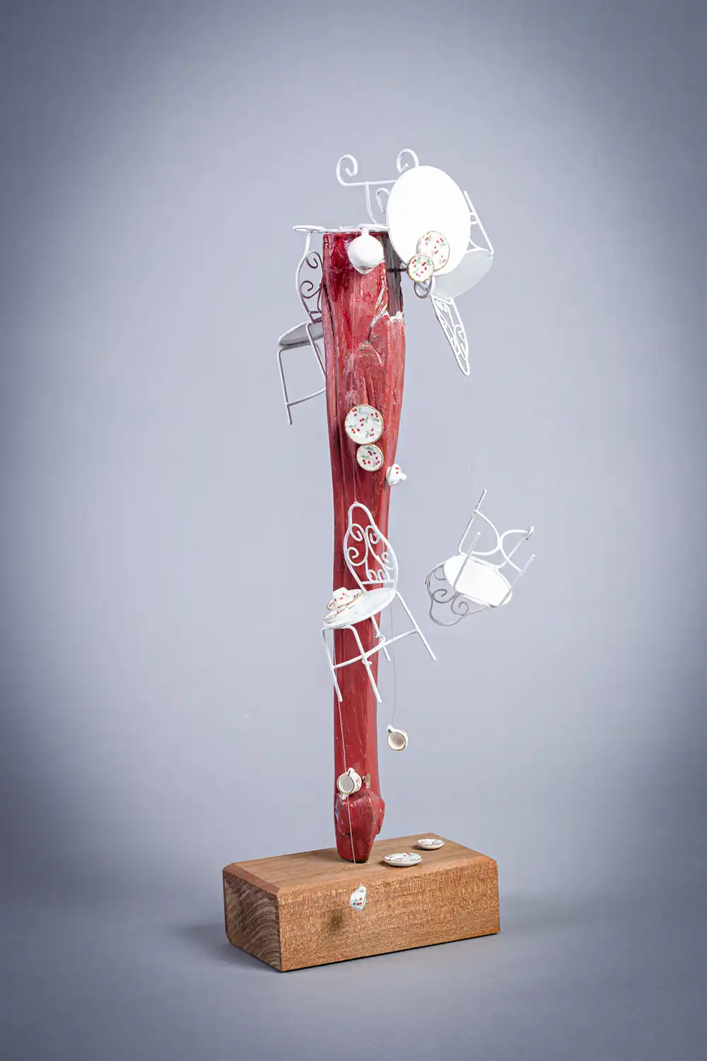 A la estrategia paródica, le sigue el desarrollo de un conjunto escultórico en el que explora ciertas claves formales de la abstracción, anclándola al espacio doméstico sugerido por los fragmentos de mobiliario que le sirven de materiales. Las patas de mesa son sus protagonistas y el equilibrio el aspecto que se pone en permanente tensión. No resulta casual que la pieza que da soporte y estabilidad a la mesa, aparezca aislada, levitante, inestable. La artista explora los recursos formales de la escultura y la carpintería, para hablarnos de un desequilibrio estructural. Porque la mesa, es tanto espacio de trabajo, como lugar de reunión. La mesa es el lugar en el que nos sentamos a pensar o dialogar y ha sido símbolo de acuerdo político en las últimas décadas de conversación pública. Que aquí figure a partir de un fragmento aislado y en peligro, no es casualidad. Con humor o con calculada distancia, Angélica Echavarri aborda la violencia como un asunto grave y estructural, uno capaz de hacernos pedazos, incluido el sistema político encargado de dialogar y dar curso a las demandas ciudadanas, hoy inquietas con el orden y la seguridad.