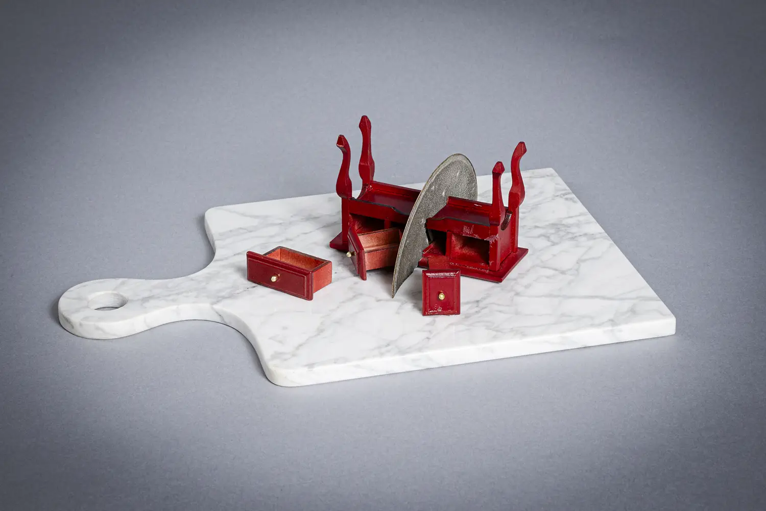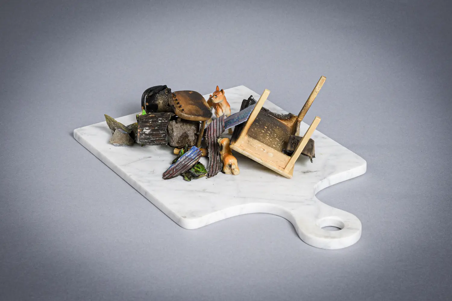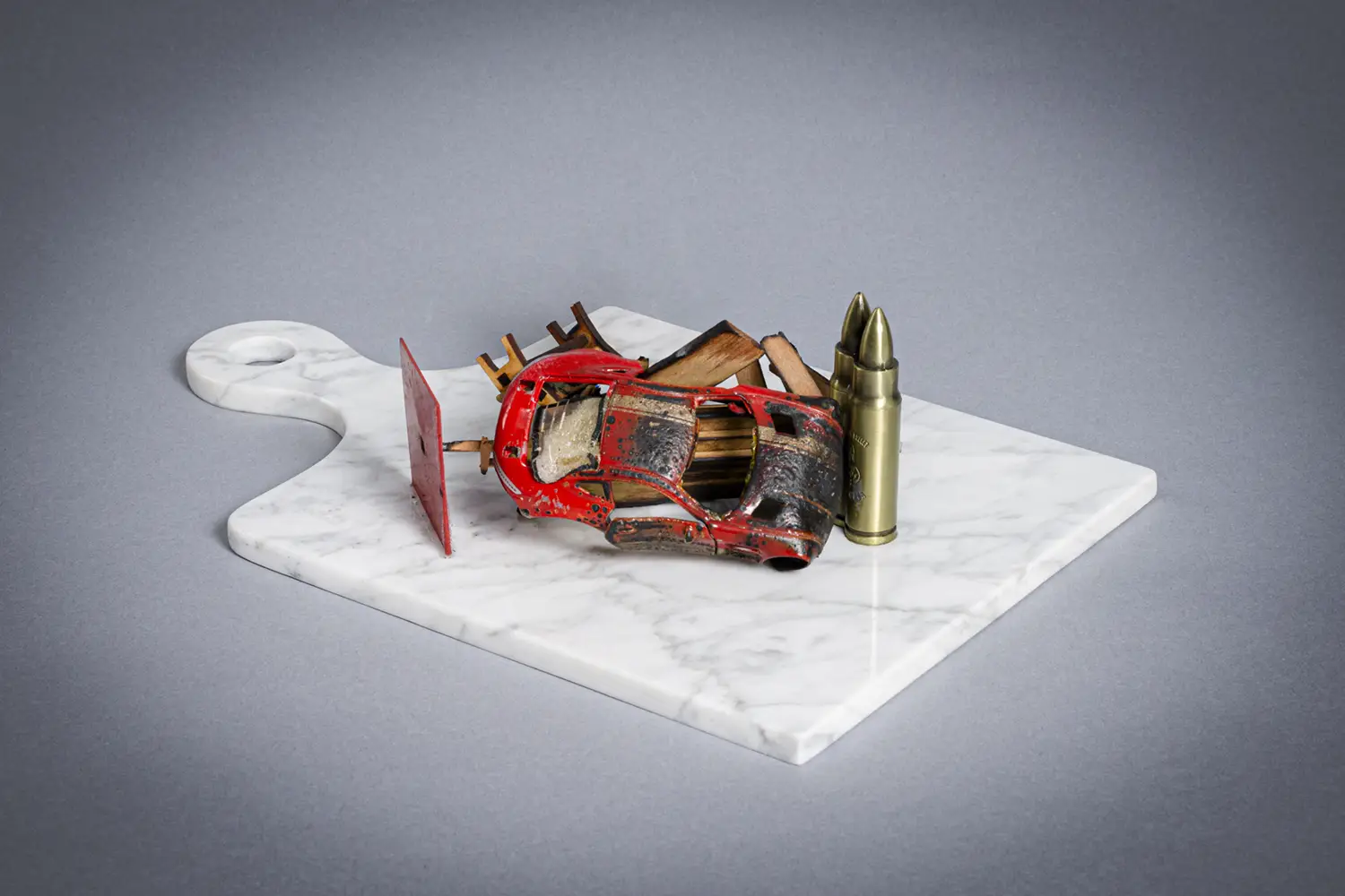 Materiales: Mármol blanco, objetos de madera, metal y otros